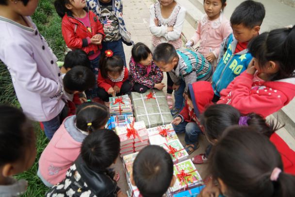 剛下課的孩子們一看到新書就迅速圍了上來,臉上流露出興奮和喜悅的光彩,眼睛里充滿了對知識的渴望。