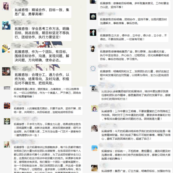 各項(xiàng)挑戰(zhàn)過后,大家都積極進(jìn)行分享總結(jié),討論個(gè)人與小組的成敗原因,通過游戲反思工作與生活;付出有多少,收獲便會(huì)有多少,在日后的工作中,以結(jié)果為導(dǎo)向,為了目標(biāo)找方法,不找借口,發(fā)揮團(tuán)隊(duì)的力量,凝心聚力,決戰(zhàn)未來(lái)!