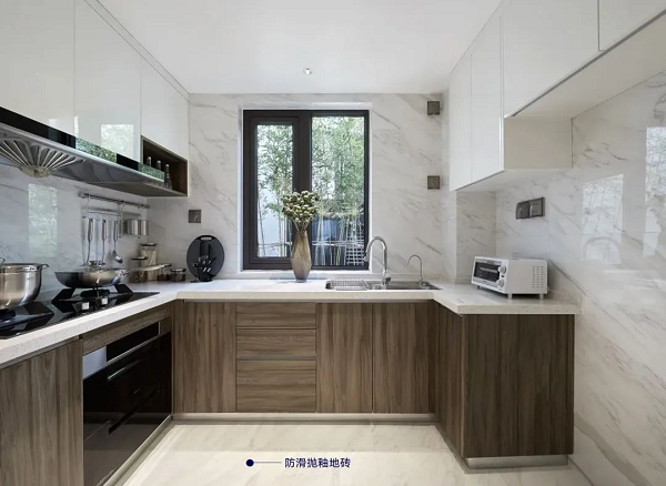 采用防滑拋釉地磚,防止地面因沾水濕滑出現滑倒的情況發生,更好保障家人的安全。