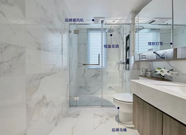 衛浴中選用品牌暖風機,集取暖、換氣、照明、吹風于一體,通過特有送風技術,以實現全方位的高效速暖,覆蓋范圍更全面,均衡維持浴室理想溫度,使業主盡享如沐春風的溫暖。