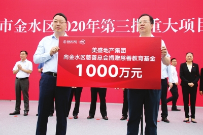 2020年9月29日,金水區2020年第三批重點項目集中開工儀式在位于美盛教育港灣的鄭州外國語學校教育集團金水外國語學校、緯五路第一小學分校工地舉行。美盛地產集團常務副總裁徐建民代表美盛地產集團為金水區慈善總會捐贈1000萬元慈善教育基金。省、市領導出席集中開工儀式,各縣(市)區相關領導分別現場匯報了重點項目開工建設情況。