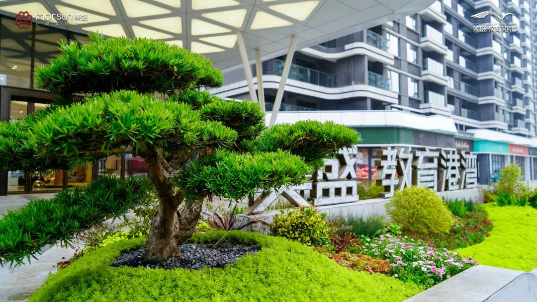 美盛教育港灣一期主入口(南入口)三株層次分明的羅漢松,給業(yè)主一種高尚品質(zhì)的共鳴、賓至如歸的體驗(yàn),使業(yè)主和到訪賓客感受家庭溫馨。進(jìn)入歸家大堂,映入眼簾的藝術(shù)裝置,向每位家人詮釋著此間的不凡。