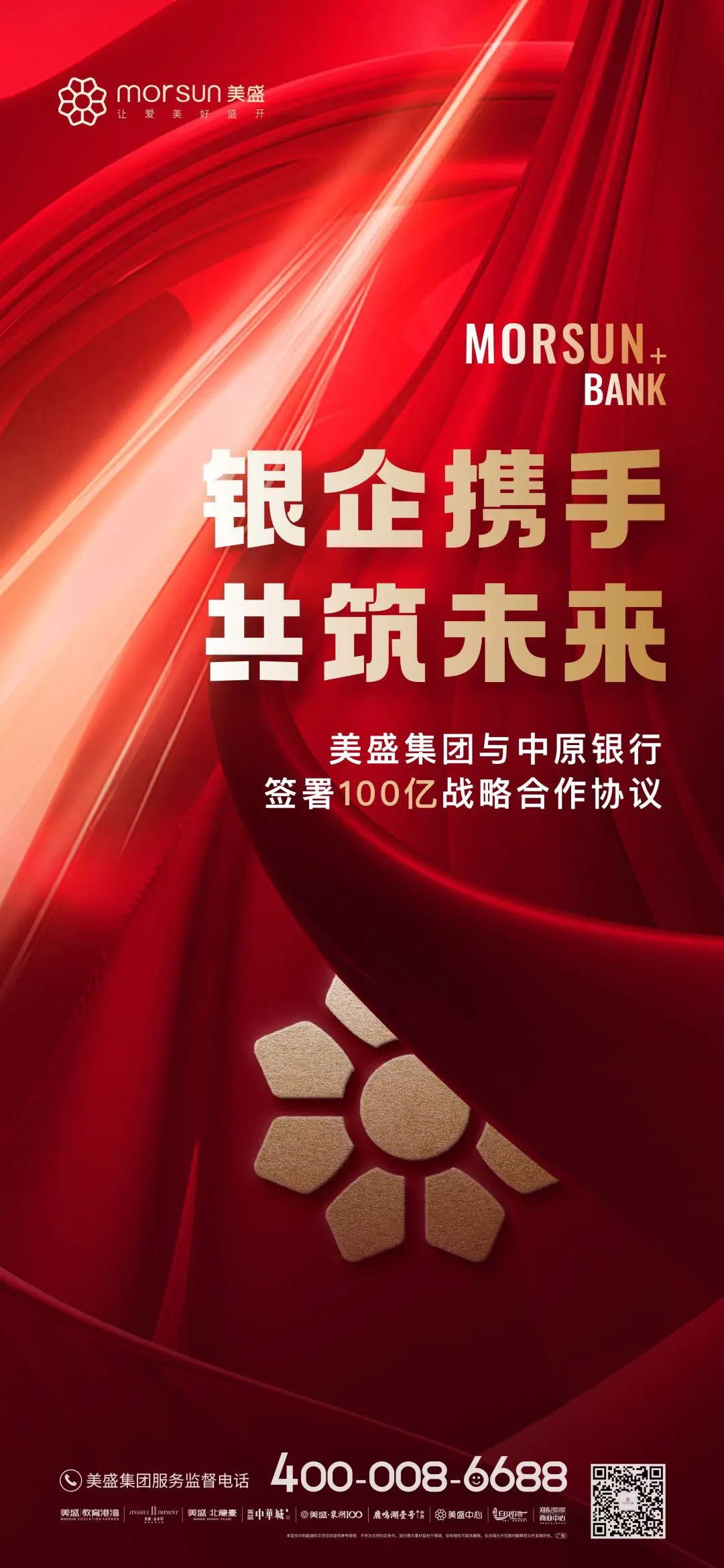 2022年12月2日,美盛集團與中原銀行股份有限公司(以下簡稱中原銀行)簽署全面戰略合作協議。中原銀行為美盛集團提供總額不超過人民幣100億元的綜合授信服務。雙方本著“資源共享、優勢互補、互惠互利、合作發展”的原則,將在地產開發建設、供應鏈金融服務、業主個人金融服務、物業管理服務等領域重點開展深度合作。
