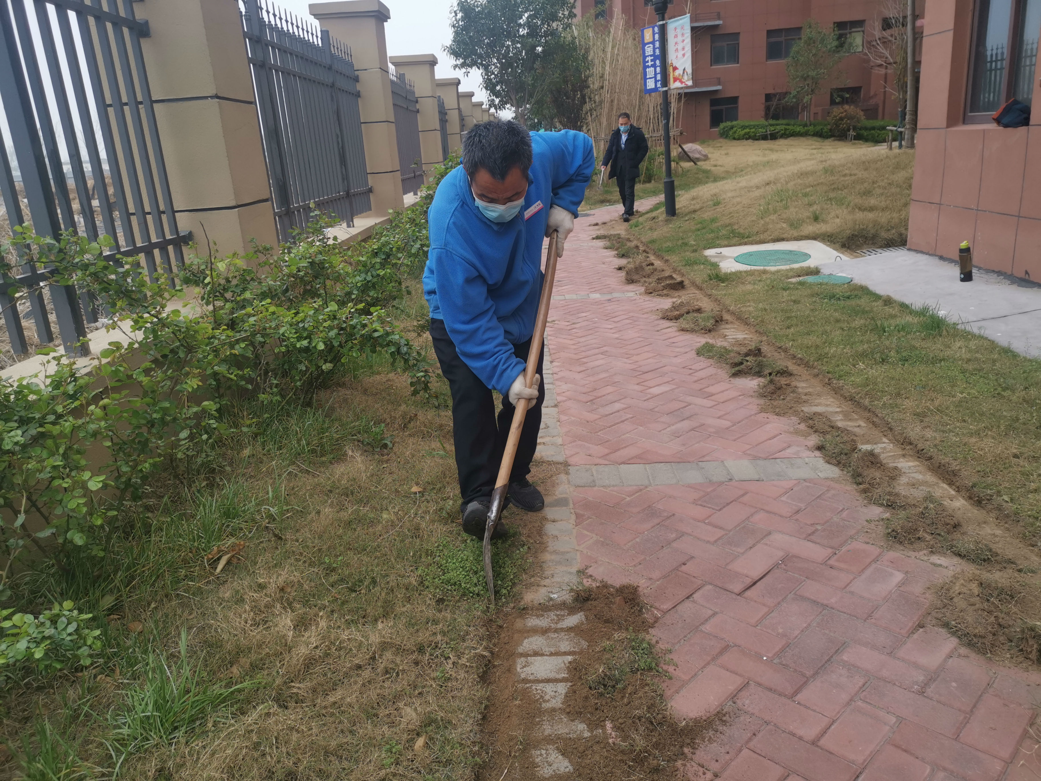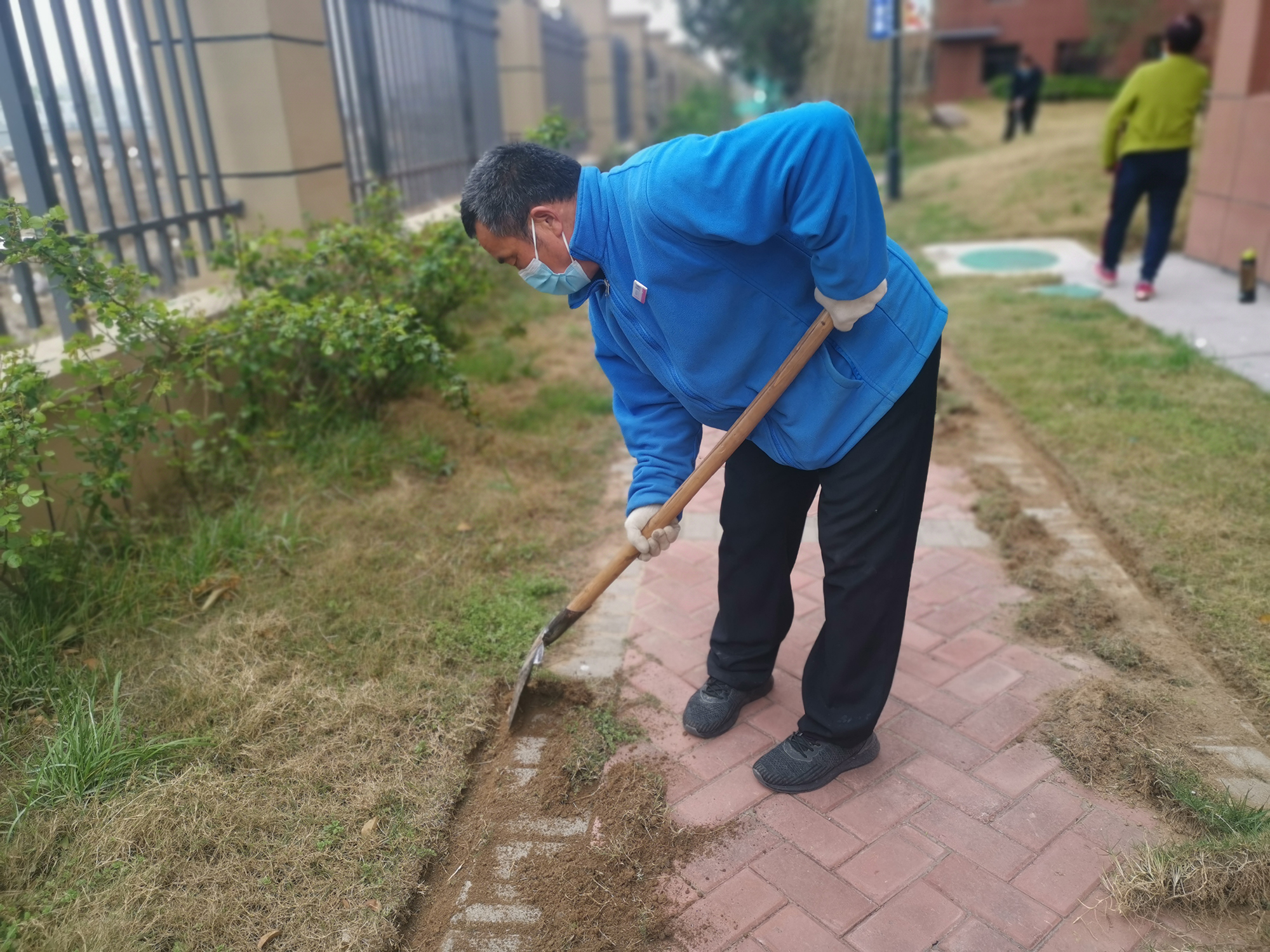 第一次在項目上見到他,他在低頭拿著鐵锨認真的整理綠化帶的隔離溝,說話的時候,沒有停止手中的工作,只是抬頭靦腆的笑笑又繼續投入到工作中。春天萬物復蘇,草坪里的花草經過一冬天的洗禮,開始瘋長,草根隨著地磚蔓延到道路,盤根錯節的很難清理,花草就像做人也需要適時的梳理,才能長得更好。于是王師傅想到一個辦法,利用每天工作之余專門挖綠化隔離溝。跟他交談的時候,問他默默的做了多久,他說差不多一個月,每天挖三四個小時,還得一周的時間才能清理干凈。