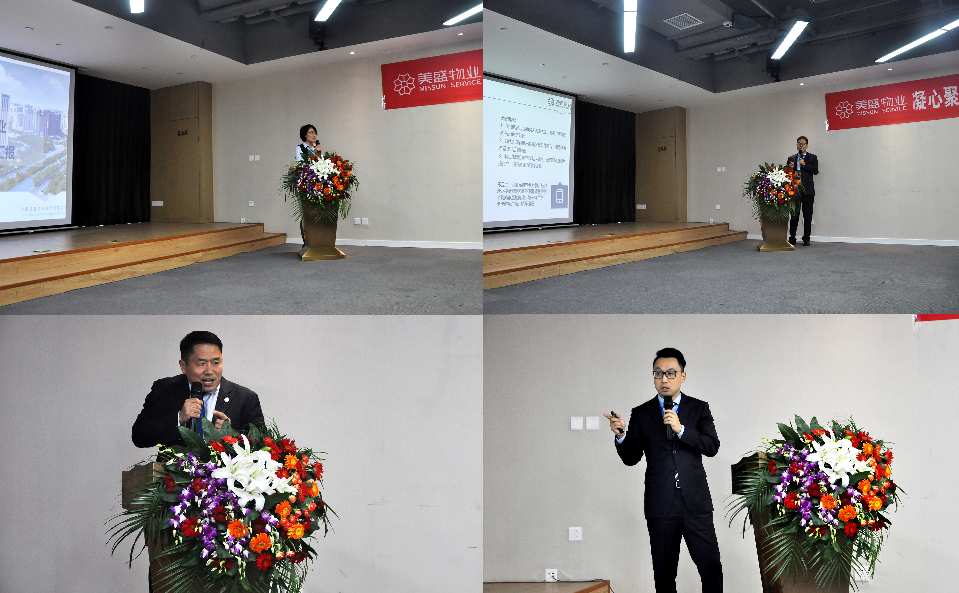年中總結會主要議程——工作匯報,分別由鄭州分公司、漯河分公司、許昌分公司、美盛中心、南陽分公司、品牌運營部、經營部、人力行政部、工程前介部、物業部、財務部等主要負責人,一一匯報各自2020年上半年的工作總結與下半年的工作計劃。