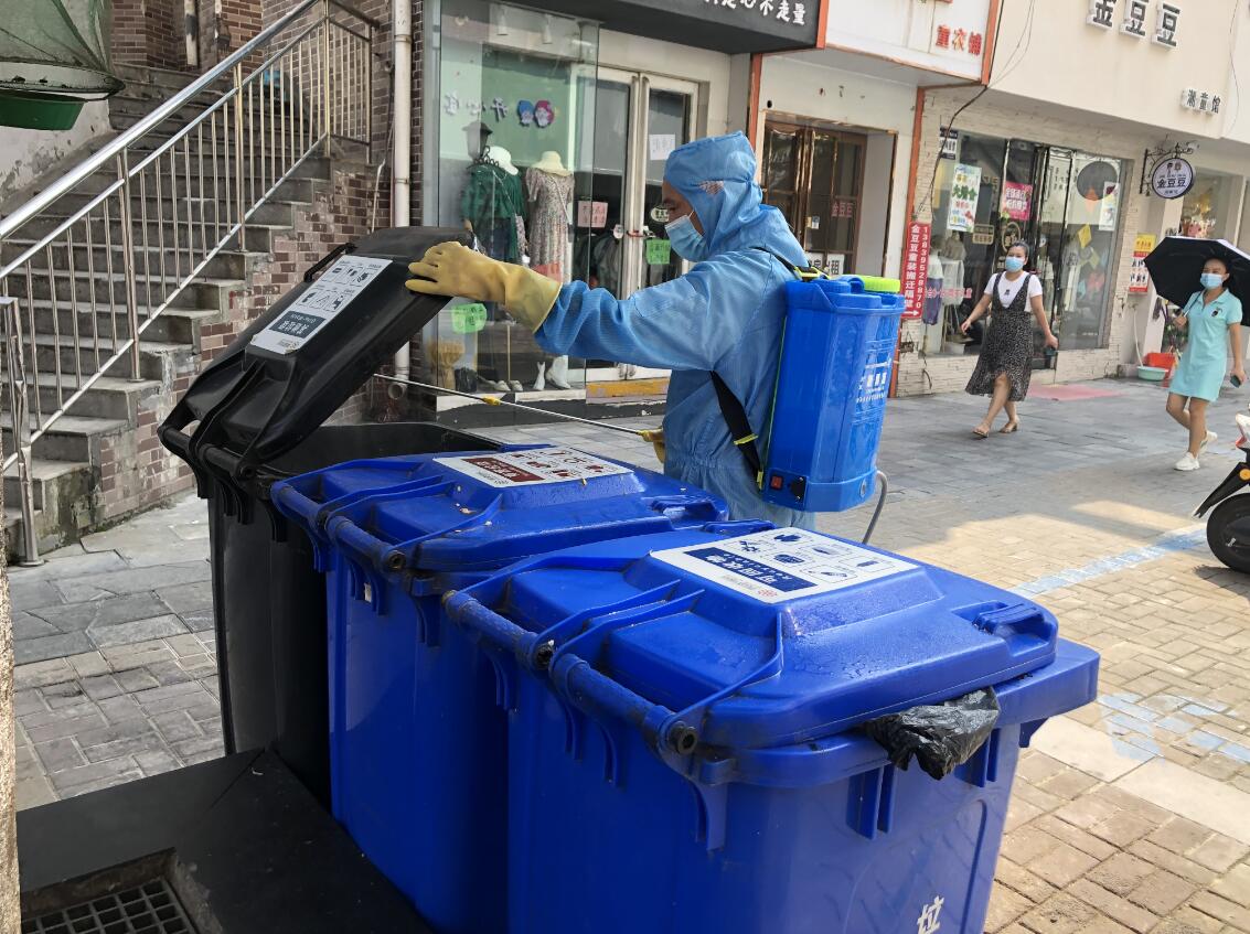 現(xiàn)場一遍遍消殺、消毒,維持秩序的物業(yè)工作人員
