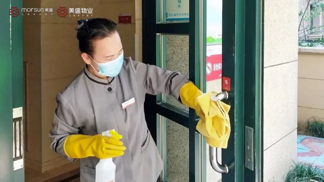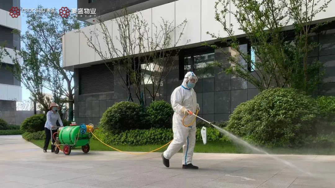 在美盛集團的各個項目里,隨處可見身著防護服的消殺人員。此次疫情,美盛物業加強了小區重點部位的保潔、消殺力度。對于小區出入口、樓棟大堂以及核酸檢測區域等高頻次的活動場所,增加消殺頻次,不遺漏任何死角。